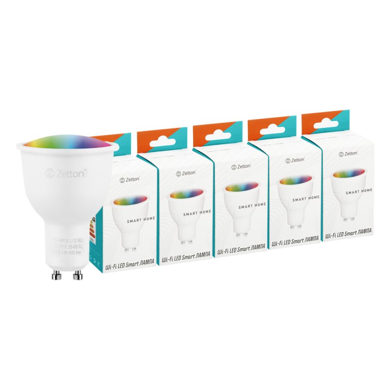 Особенности: Комплект умных ламп (5 шт). Подключается к приложению умный дом через Wi-Fi, что позволит управлять работой лампы дистанционно с помощью смартфона или планшета, вы можете менять уровень яркости, переключать режимы, проверить работу ламп перед уходом из дома. Ультранизкое энергопотребление в 5 Вт. Обеспечивает яркость в 400 люменов. Время работы 15000 часов.